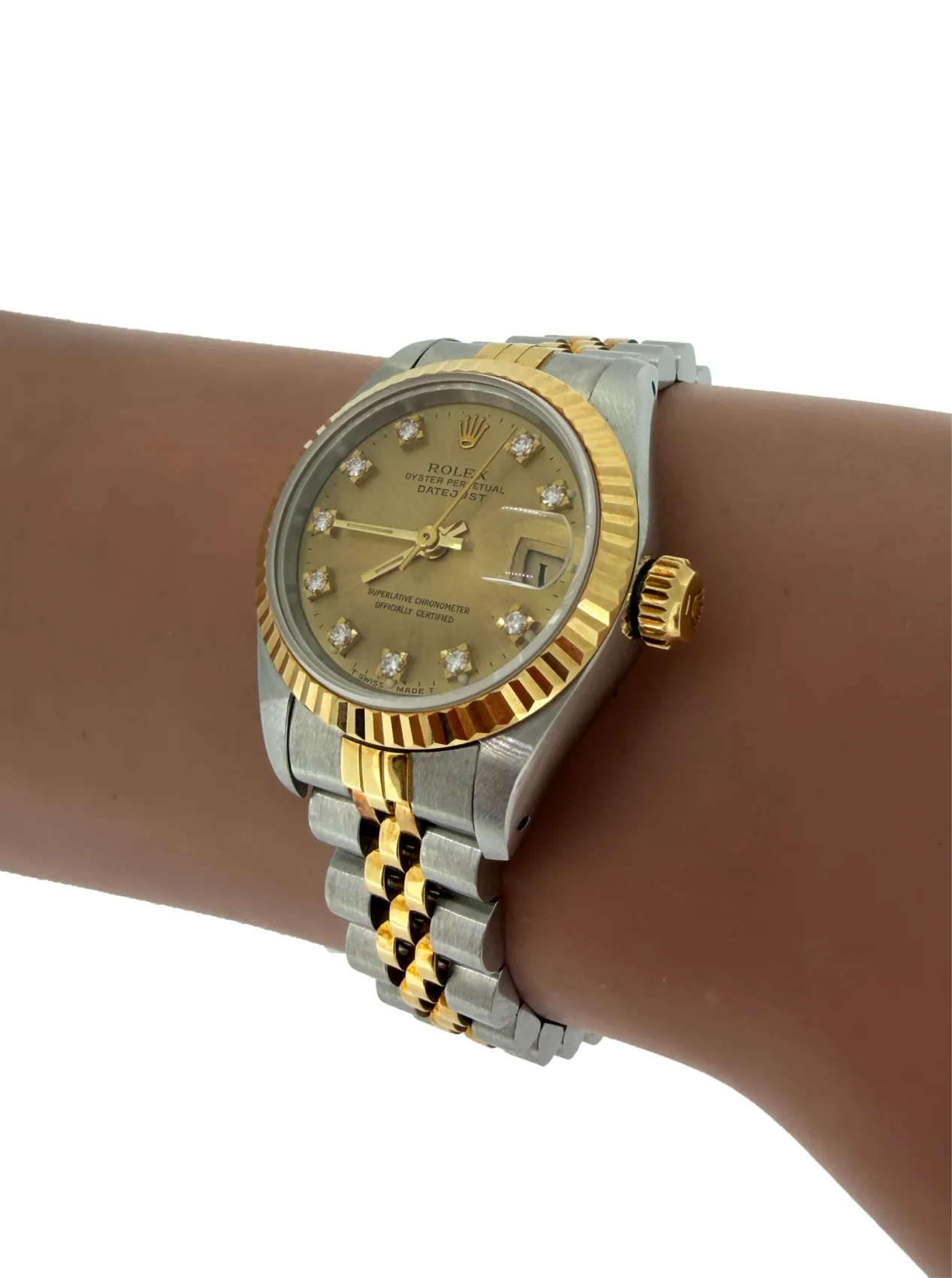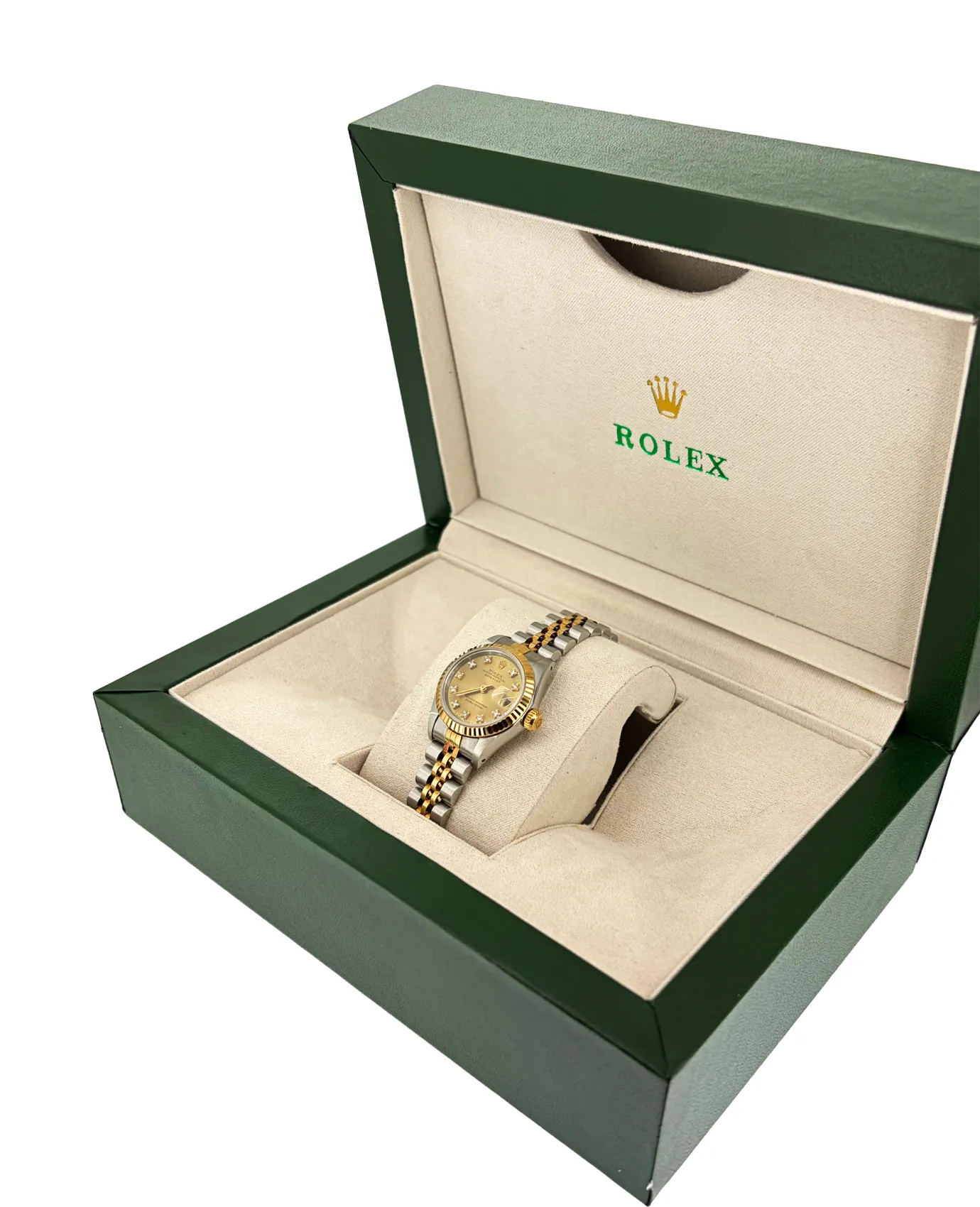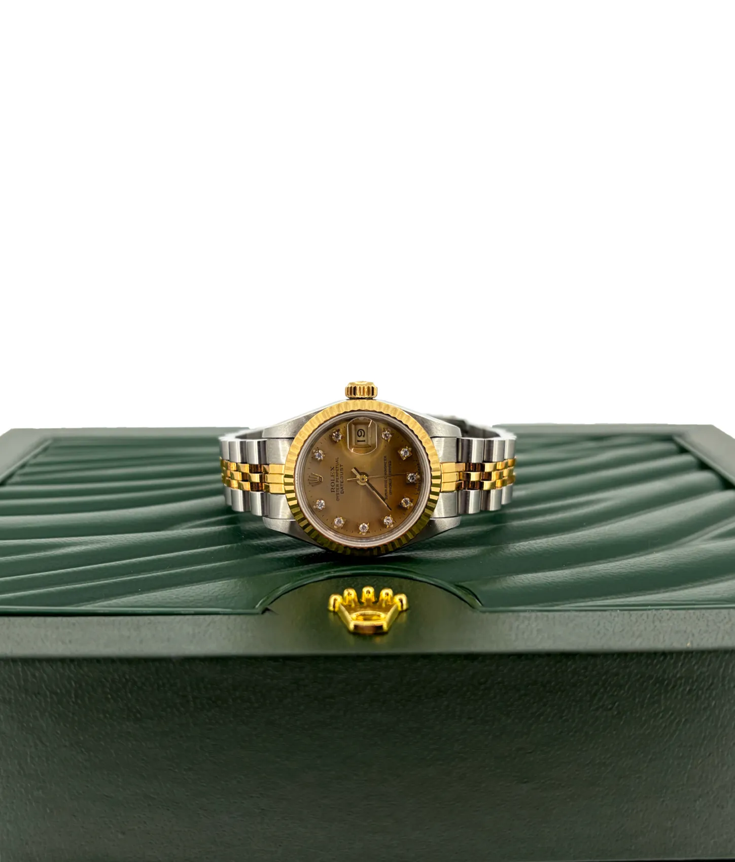 A timeless vintage piece, this Rolex Datejust features a 26mm case crafted from an elegant combination of 18ct Gold and Stainless Steel. Enhanced with diamond detailing, it offers a refined balance of luxury and classic design. Presented with its original 1987 box and papers, this watch is a true collector’s item. The bracelet is fully adjustable, ensuring a comfortable and secure fit for everyday wear.