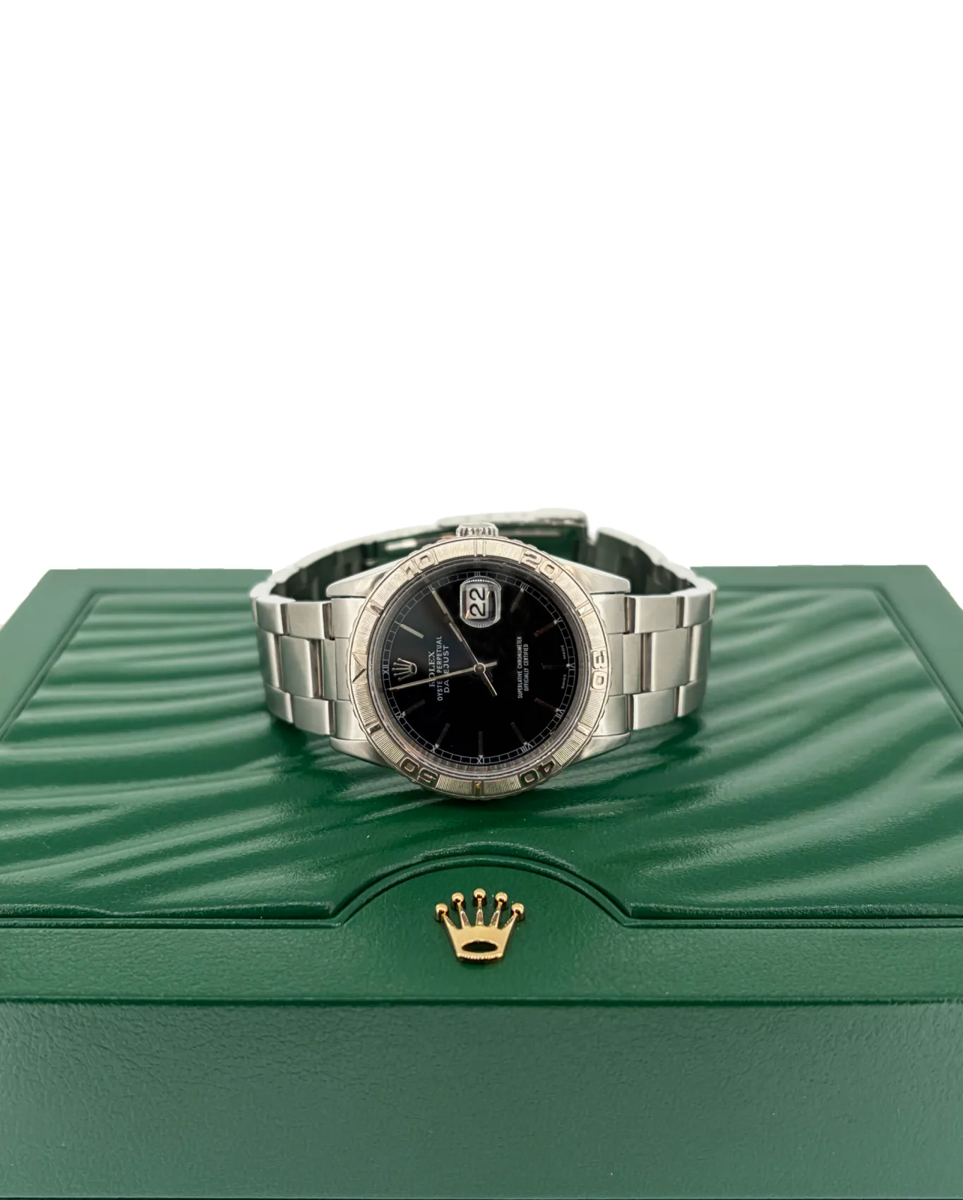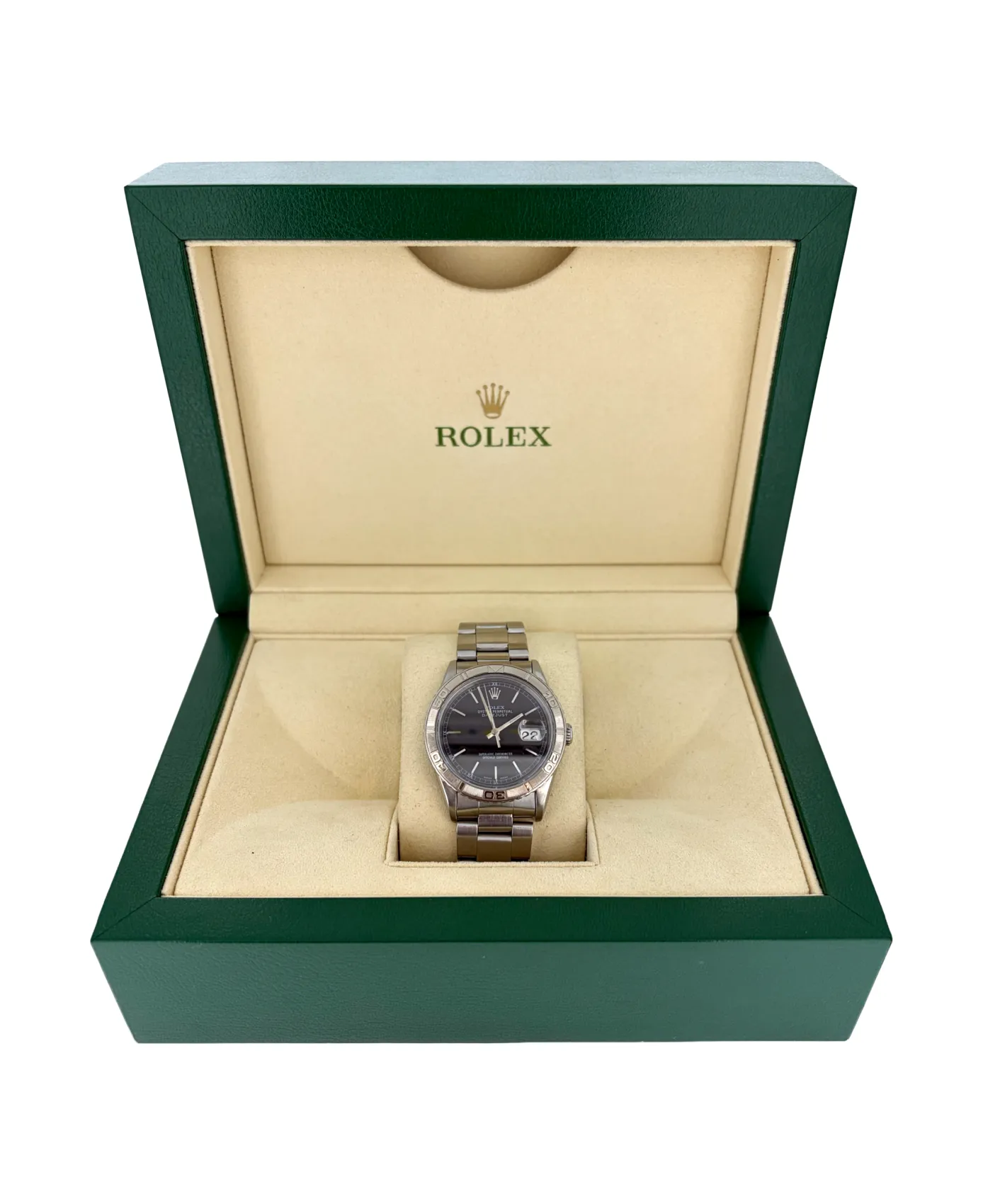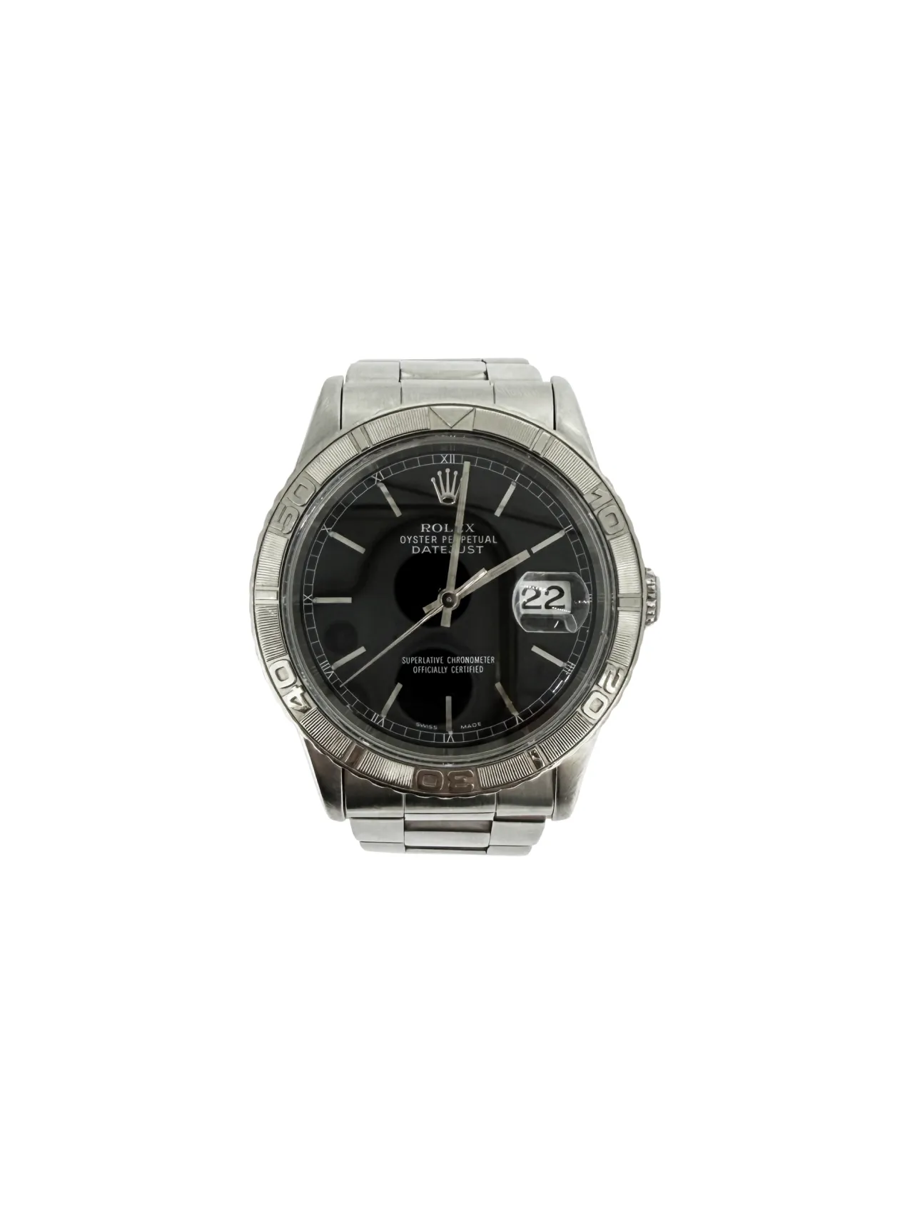 A distinctive take on the classic Datejust, this Rolex features a 36mm stainless steel case paired with the iconic Turn-O-Graph rotating bezel, blending sporty functionality with timeless design. Dating from 1997 and presented with its original box and papers, this model is highly desirable among collectors. The bracelet is fully adjustable, ensuring a comfortable and secure fit for everyday wear while maintaining Rolex’s signature durability and style. Turn-O-Graph Bezel