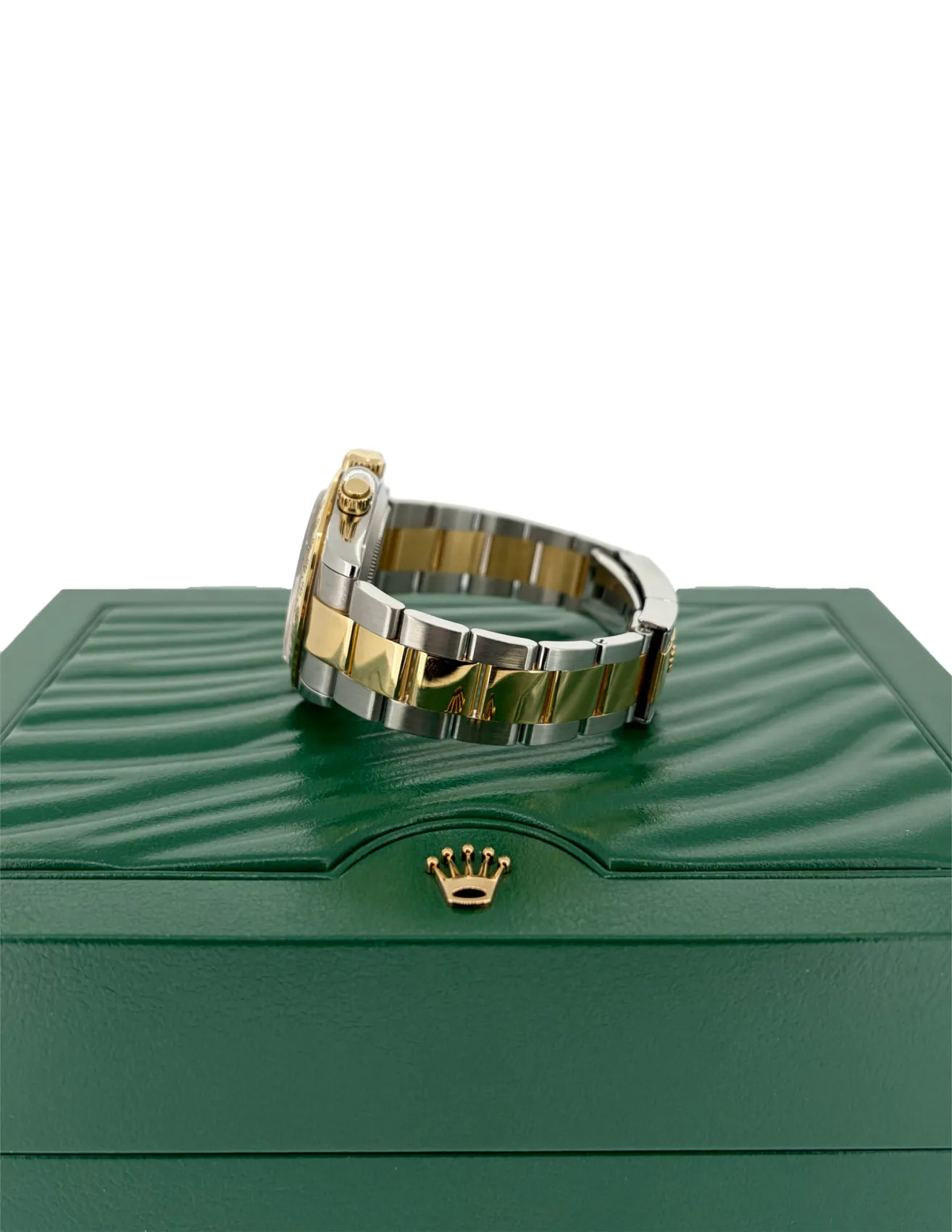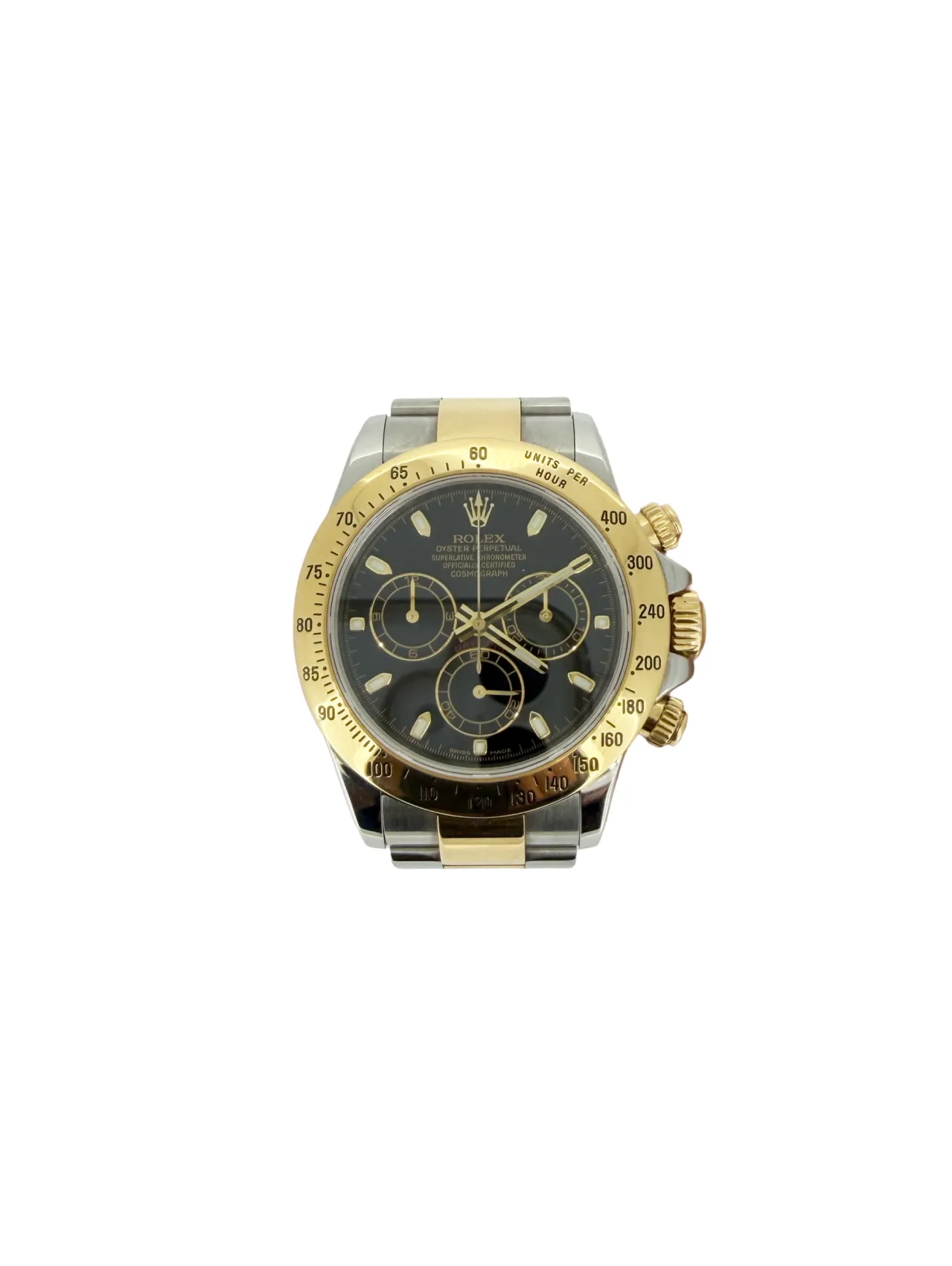 The Rolex Cosmograph Daytona 40mm (2010) is crafted from 18ct gold and stainless steel, featuring a black dial. Supplied with original box and papers.