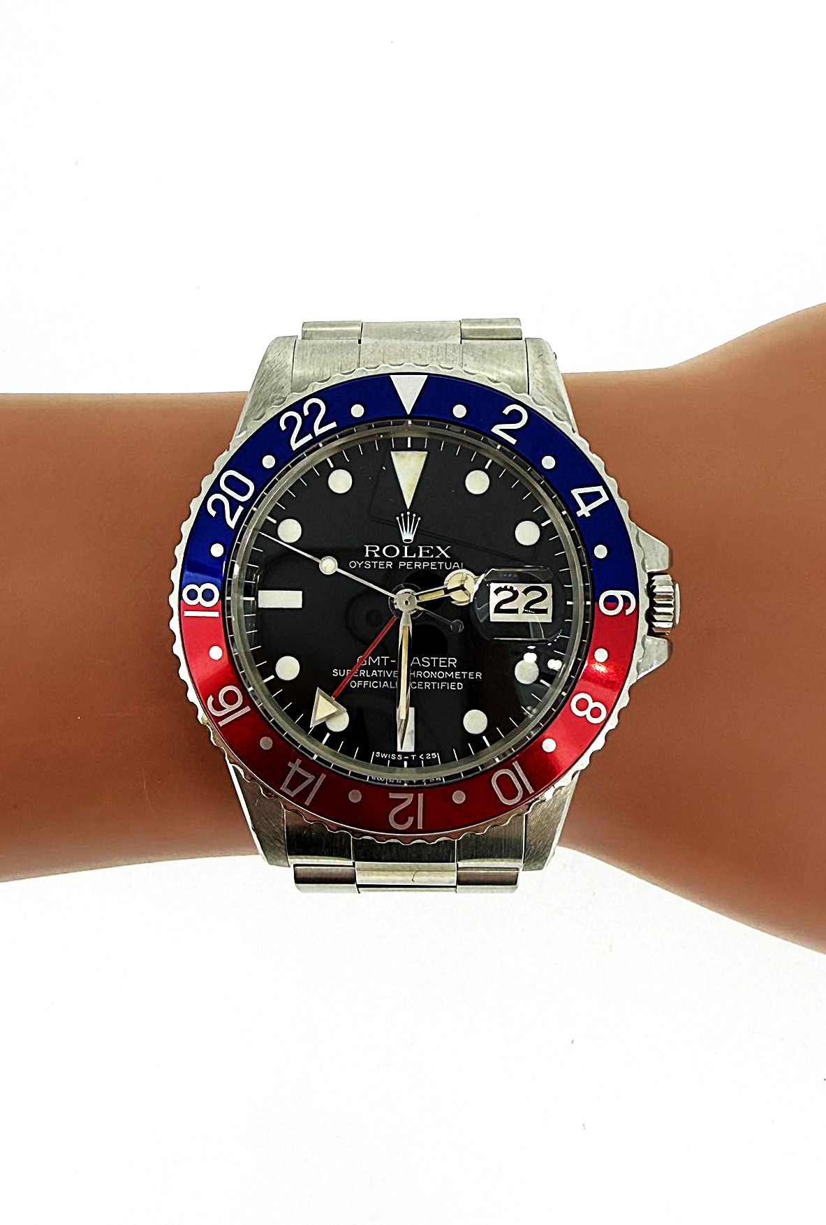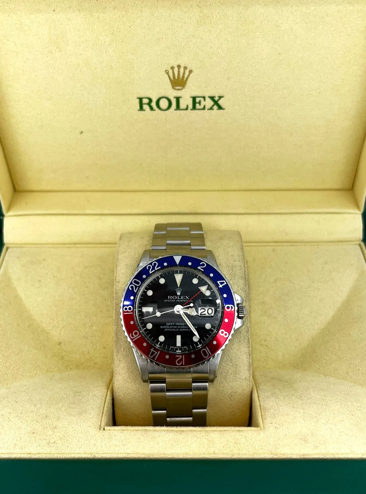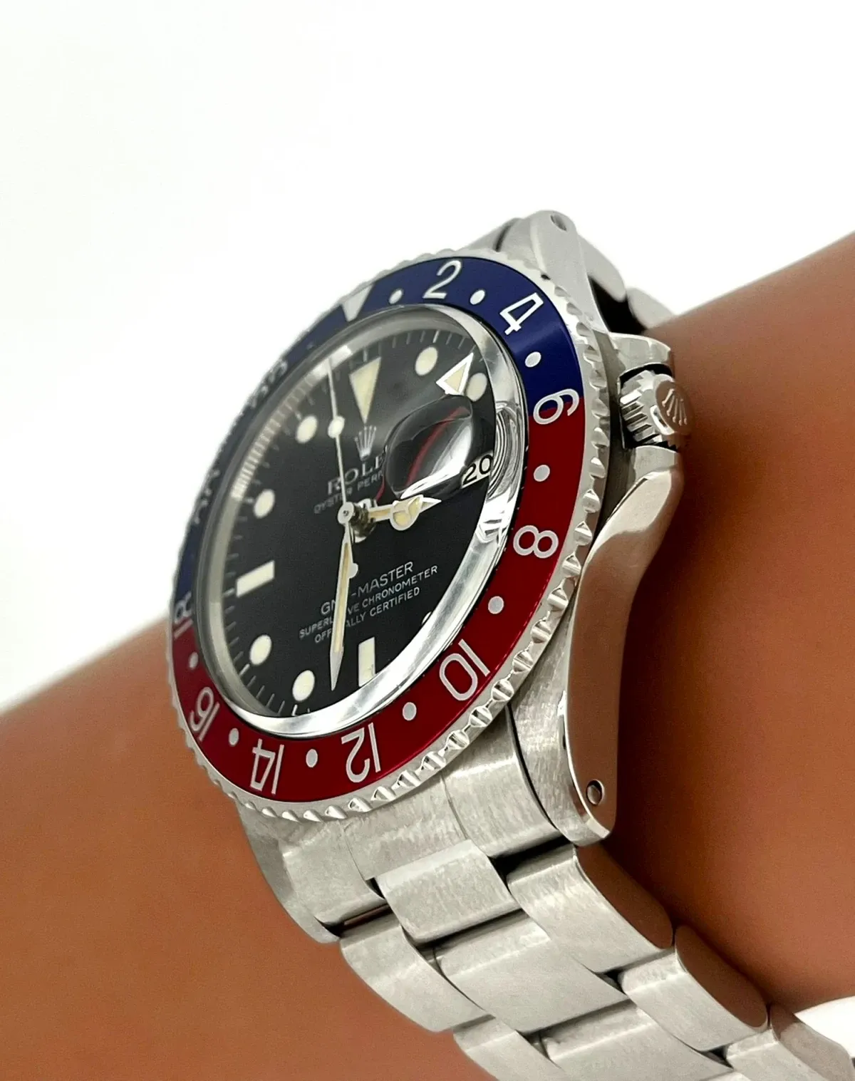 Rolex GMT-Master “Pepsi” 40mm Stainless Steel – 1966 (Ref. 1675/0) A true icon of vintage watchmaking, this 1966 Rolex GMT-Master Ref. 1675/0 embodies both timeless design and historical significance. Nicknamed the “Pepsi” for its distinctive red and blue bezel insert, the GMT-Master was originally developed in collaboration with Pan Am Airways to aid pilots in tracking multiple time zones. This particular example, crafted in stainless steel, features the classic 40mm Oyster case housing the revered calibre 1570 automatic movement. The matte black dial, complete with luminous hour markers and hands, offers excellent legibility and vintage charm. Key features: