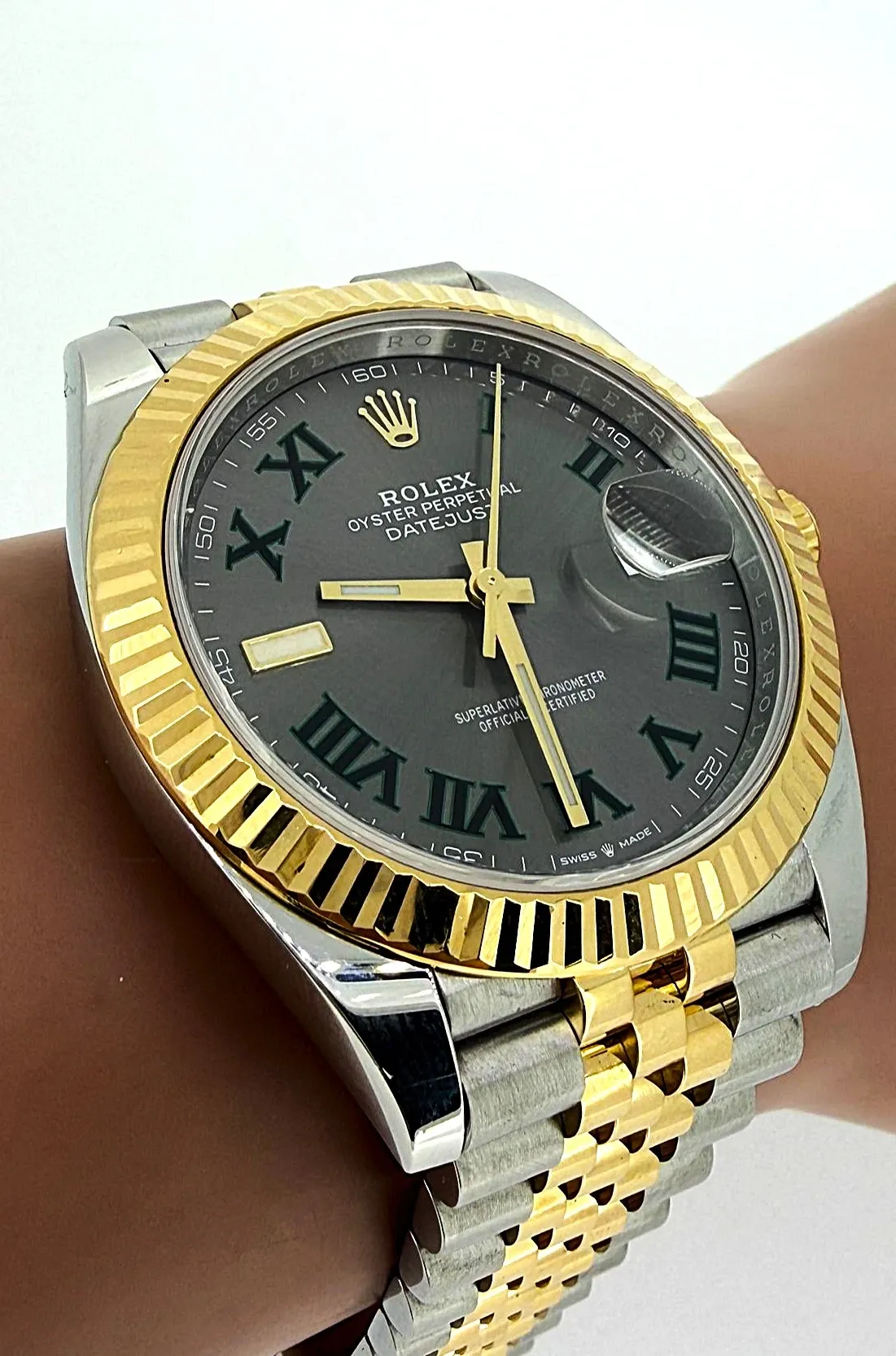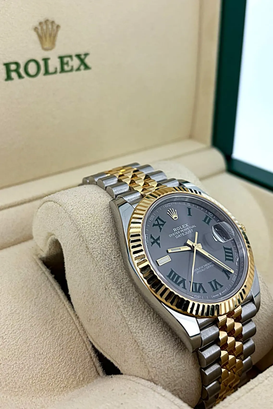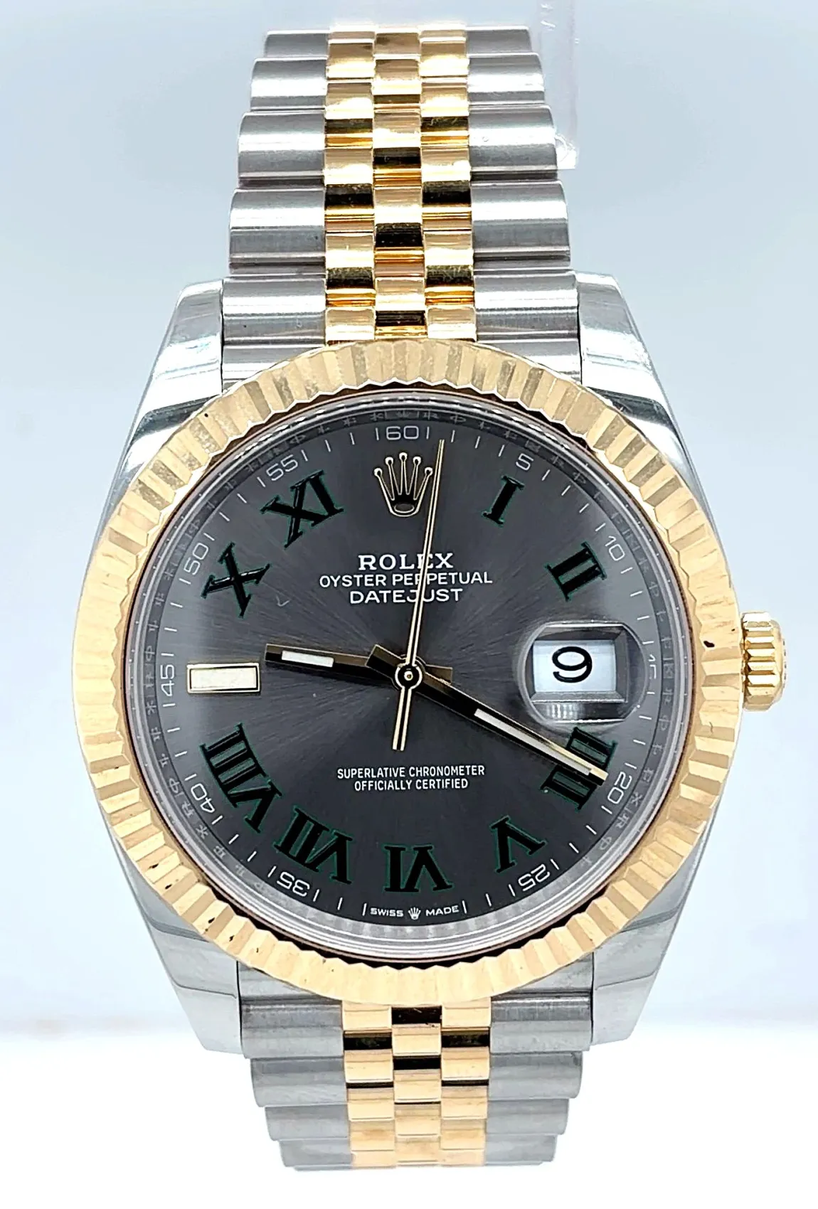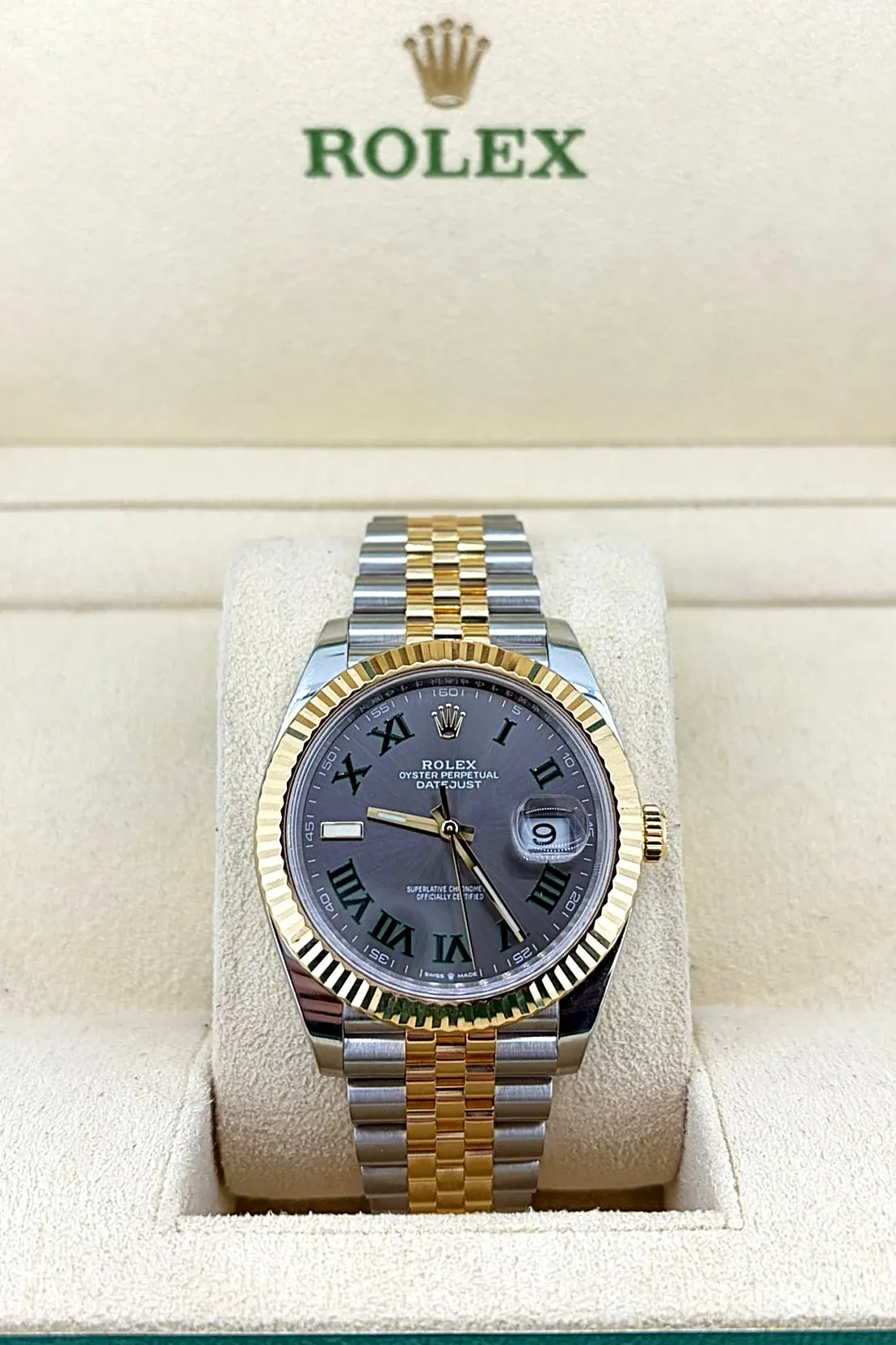 Rolex Datejust 41mm Wimbledon (Model 126331) in 18ct Everose Gold and Oystersteel, featuring the iconic Wimbledon dial. This 2026 example is supplied with original box and papers, offering a refined blend of sport and elegance.