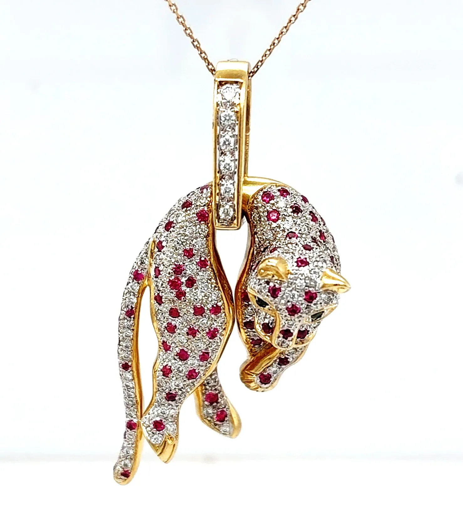 Make a bold and luxurious statement with this 18ct gold panther pendant, masterfully set with vivid rubies, sparkling diamonds, and vibrant emeralds. The intricate design captures the sleek elegance and power of the panther, making it a standout piece in any fine jewellery collection. Crafted in 18ct yellow gold and weighing 22.4g, this pendant is substantial and impressive, yet carefully balanced for comfortable wear. The combination of gemstones creates a dazzling play of colour, highlighting the artistry and attention to detail in every curve and contour. Details:
