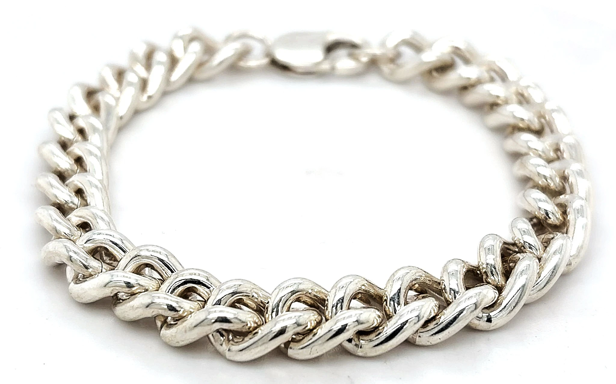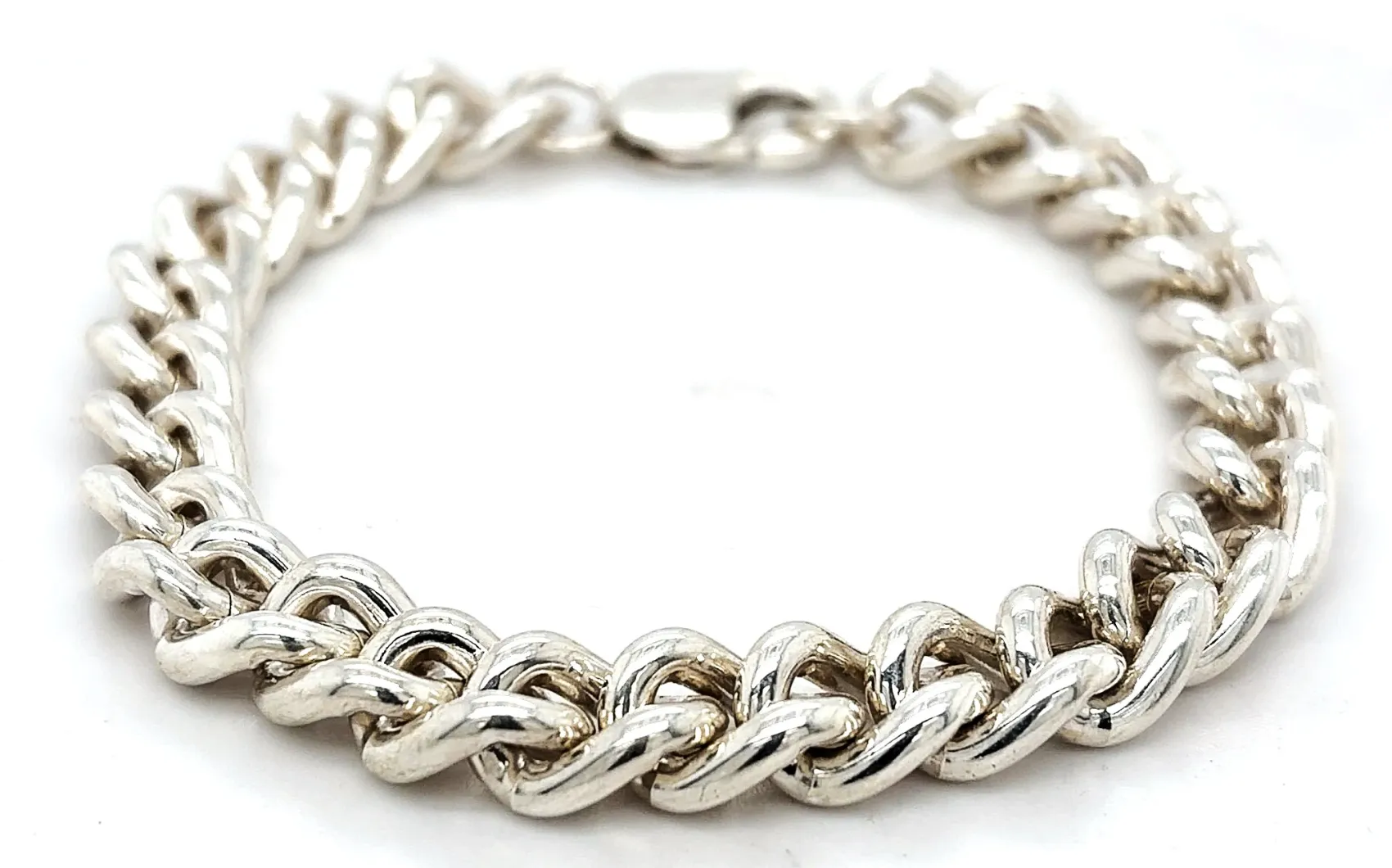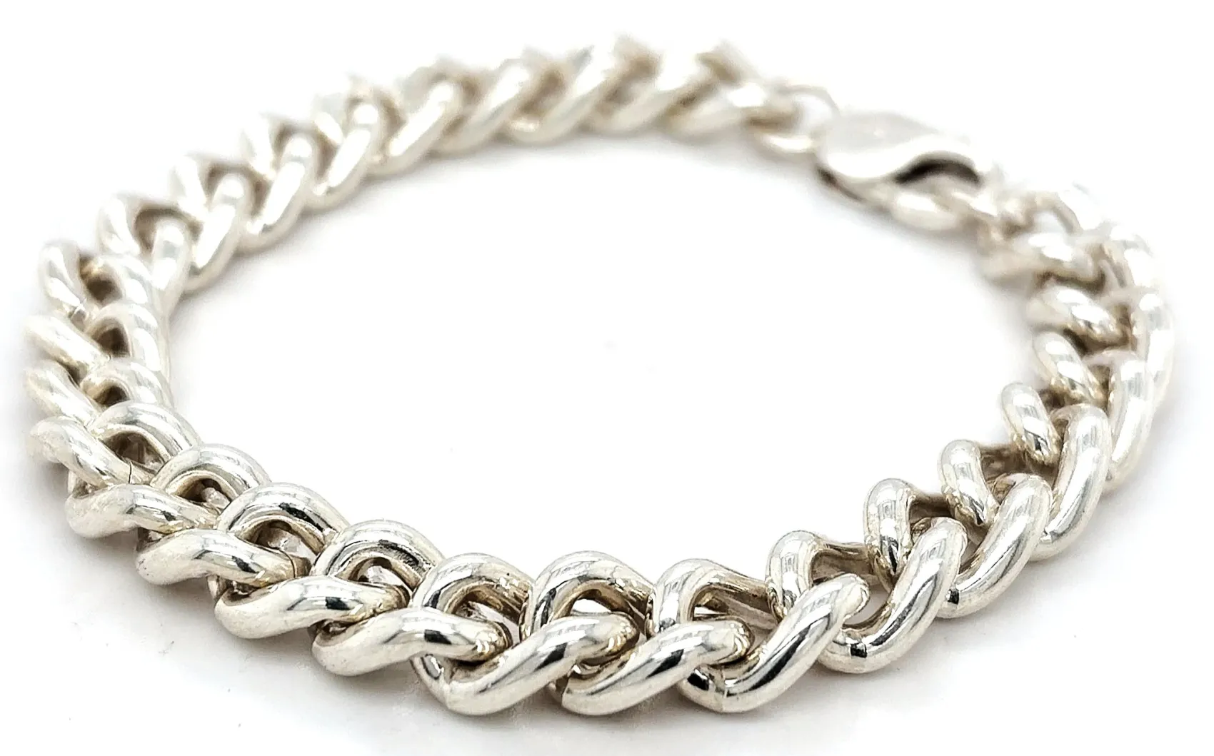 Make a bold statement with this solid sterling silver traditional curb bracelet, featuring a substantial 10mm width for a striking, classic look. Each link is expertly crafted to create a smooth, interlocking design that is both durable and stylish. Made from high-quality 925 sterling silver and weighing 58.4 grams, this bracelet offers a substantial feel without compromising comfort. The adjustable length of up to 9 inches ensures a perfect fit for most wrists. Perfect for everyday wear or special occasions, this curb bracelet is a timeless accessory for men and women alike, and an ideal gift for anniversaries, birthdays, or heritage-inspired style