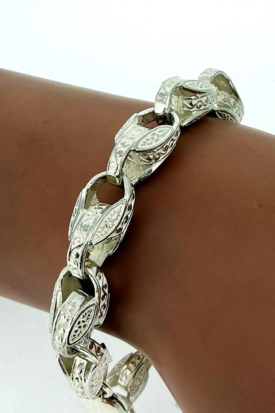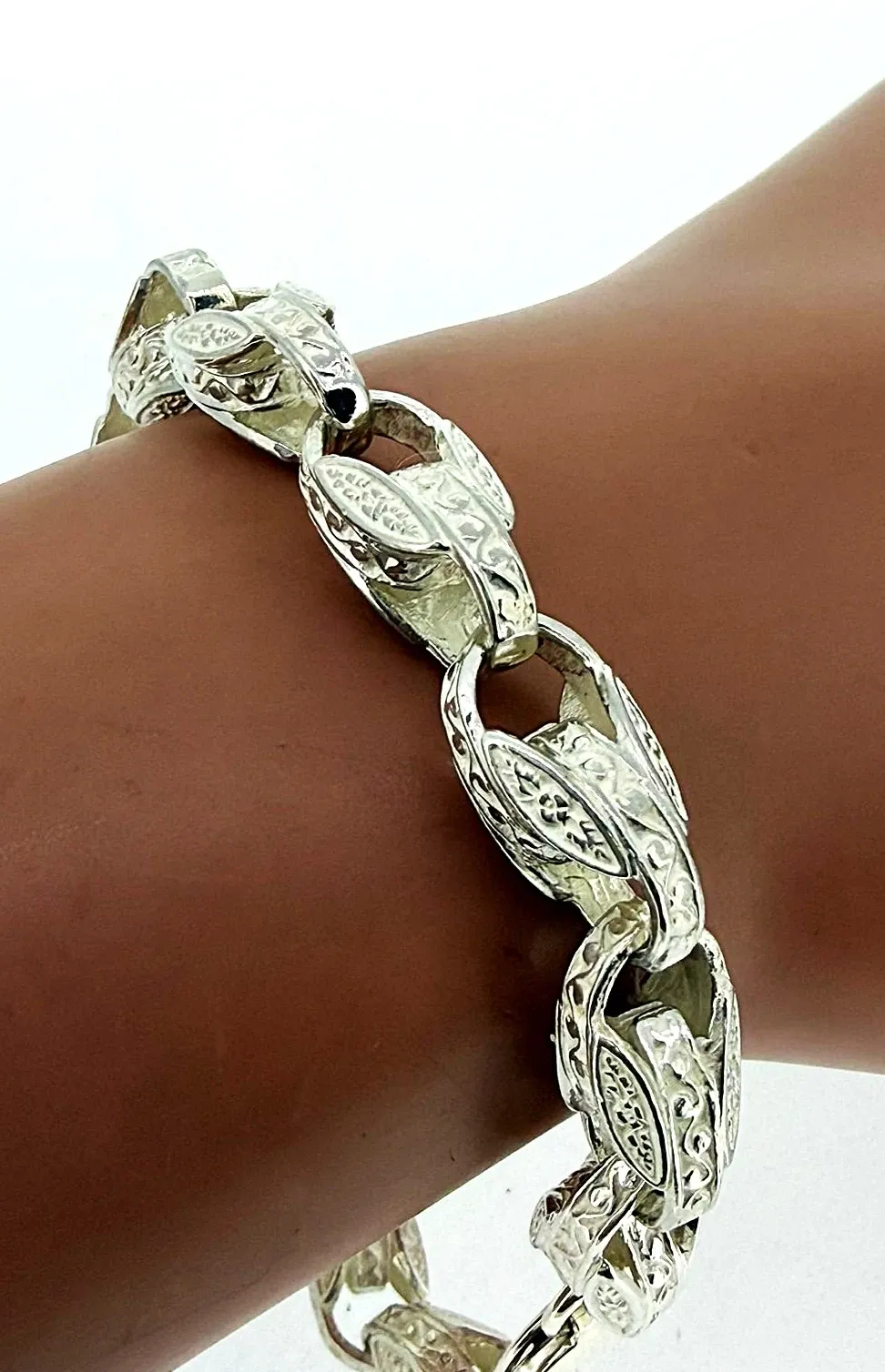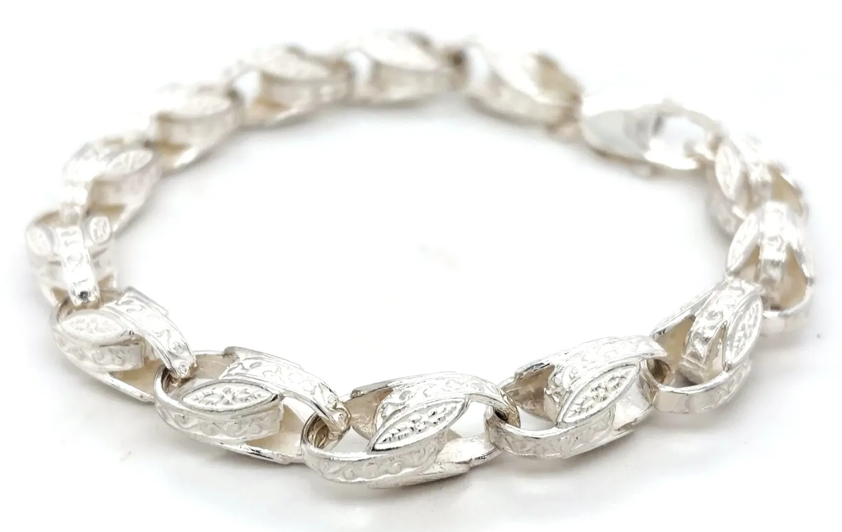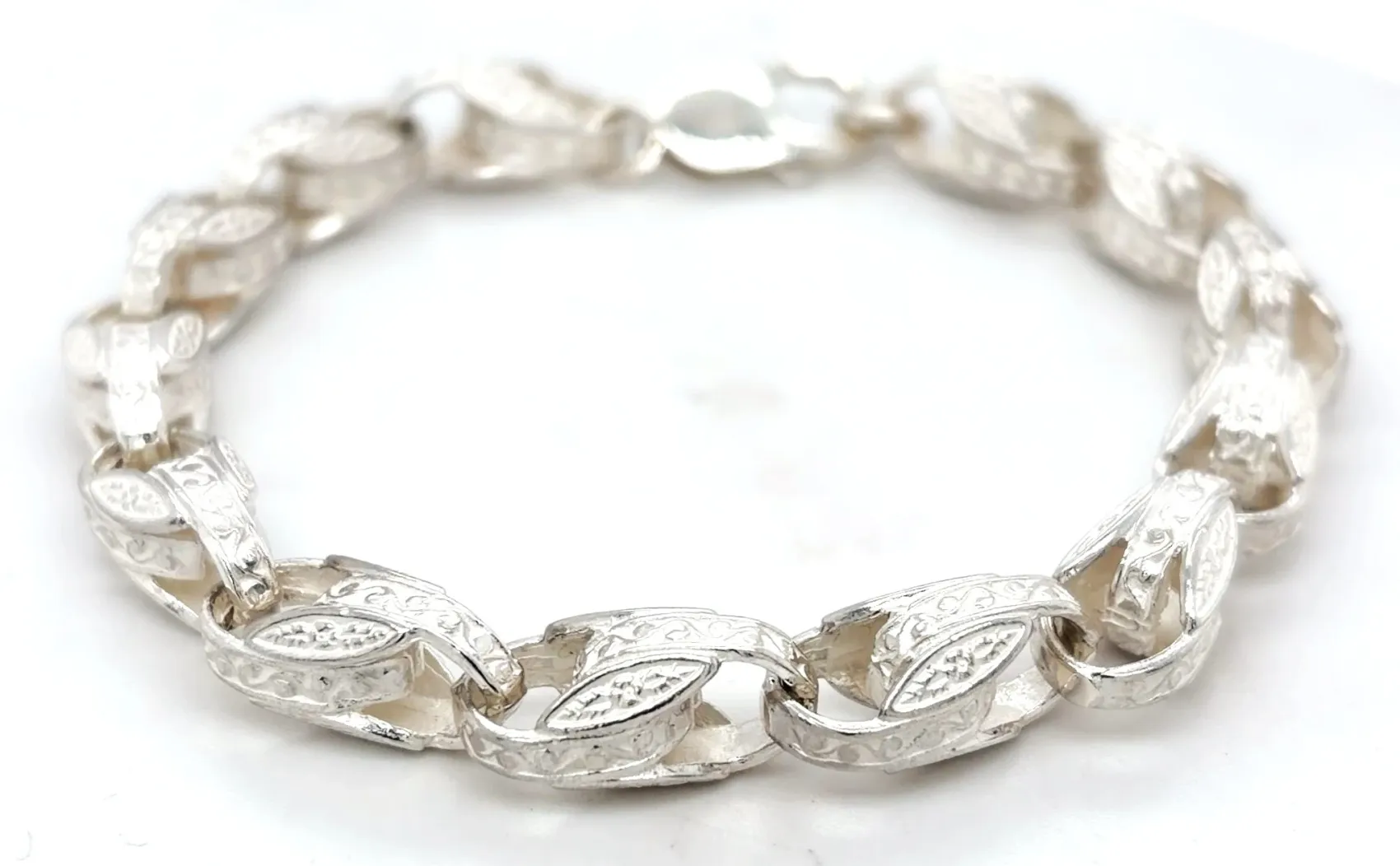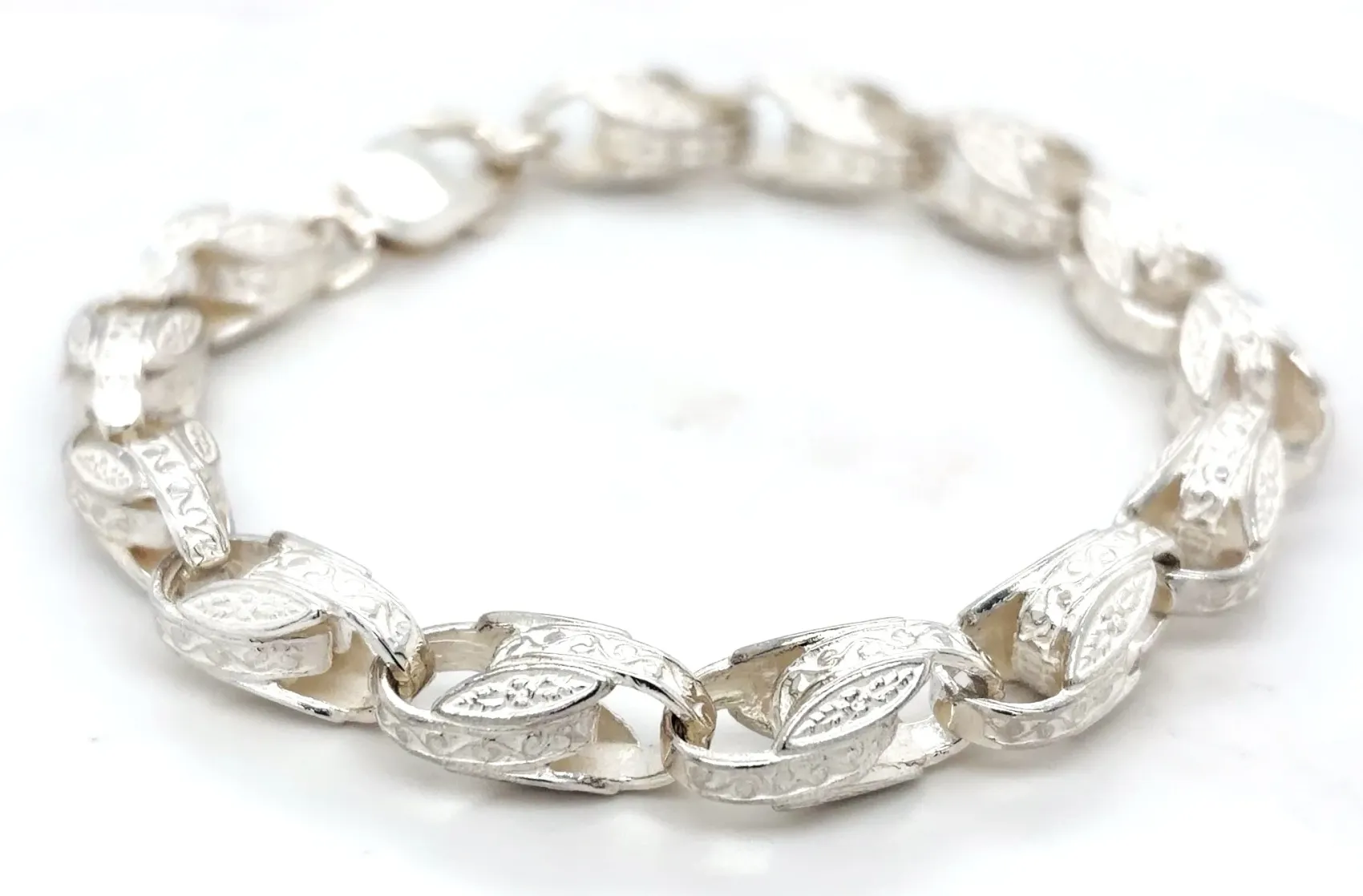 Sophisticated and stylish, this solid sterling silver tulip link bracelet features a 8.7mm width with elegantly interlocking tulip-inspired links, offering a modern twist on a classic design. Crafted from 925 sterling silver and weighing 31.7 grams, this bracelet combines durability with a substantial, high-quality feel. The adjustable length of up to 9 inches ensures a comfortable fit for most wrists. Perfect for everyday wear or special occasions, this tulip link bracelet is a versatile statement piece and an ideal gift for birthdays, anniversaries, or heritage-inspired jewellery collections.
