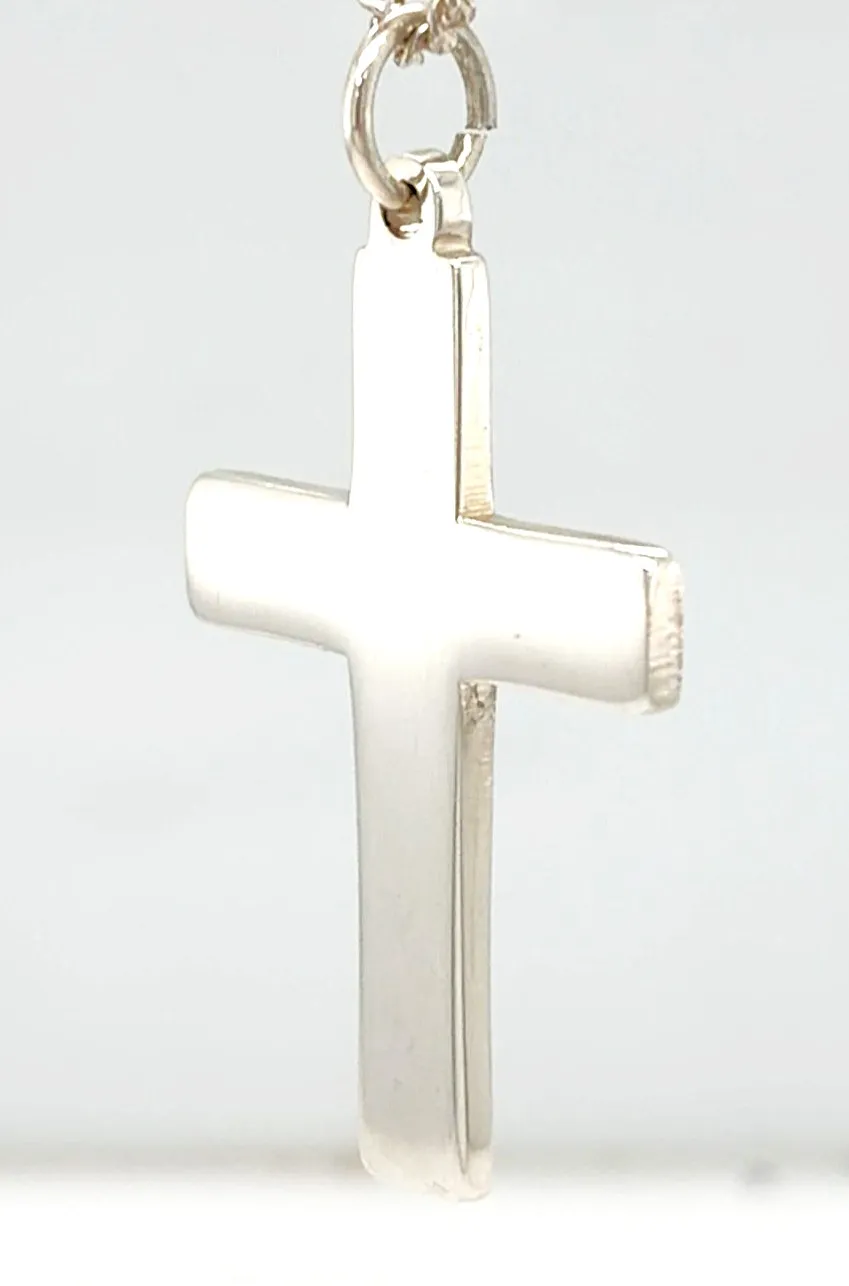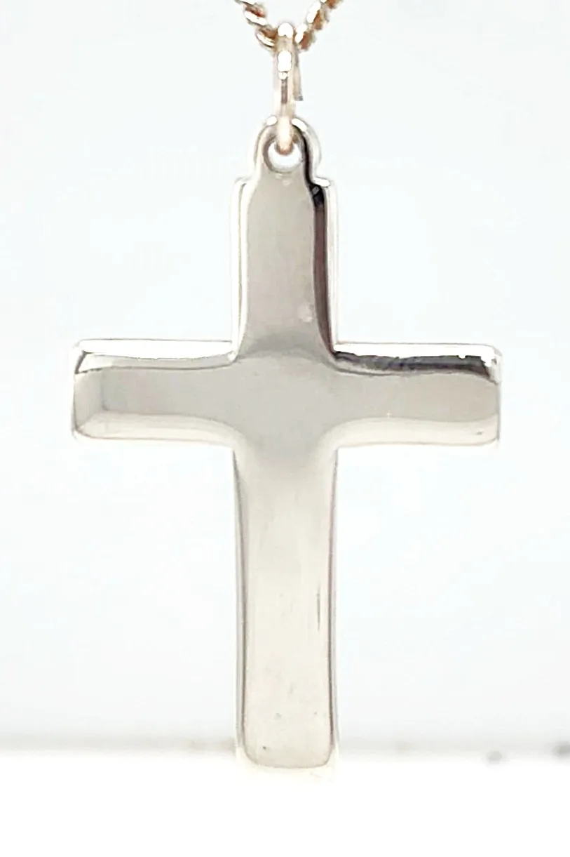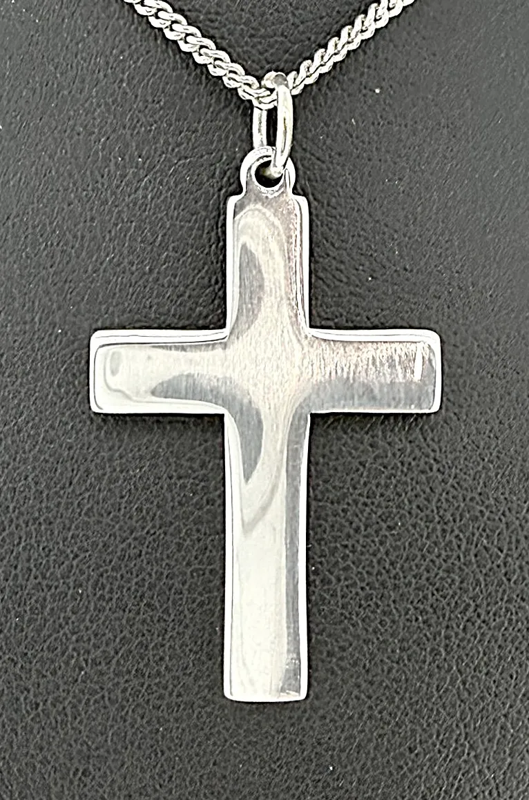 Timeless and understated, this sterling silver plain cross pendant features a clean, classic design with a smooth polished finish. Its simple silhouette makes it a versatile piece, suitable for everyday wear or special occasions. Crafted from high-quality 925 sterling silver, the pendant weighs 5.2 grams and measures 35mm x 25mm x 2.0mm, giving it a solid yet comfortable feel. The balanced proportions offer a refined look that complements a wide range of chain styles. A meaningful symbol of faith, this plain cross pendant makes a thoughtful gift for christenings, confirmations, birthdays, or as a timeless personal keepsake.