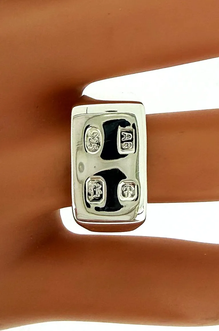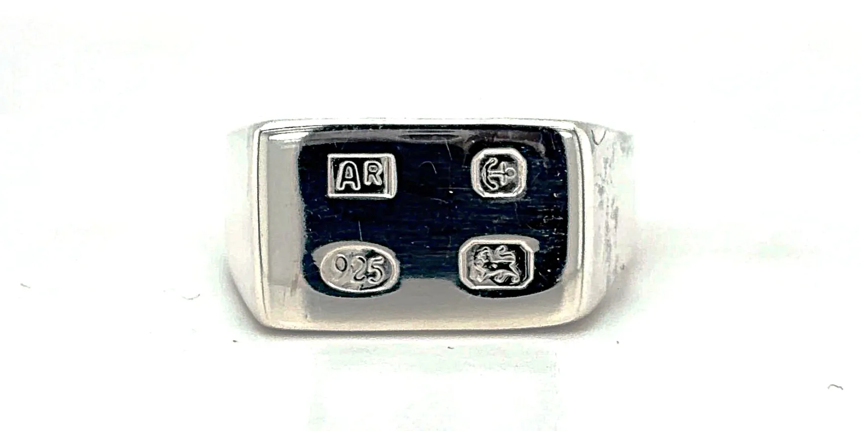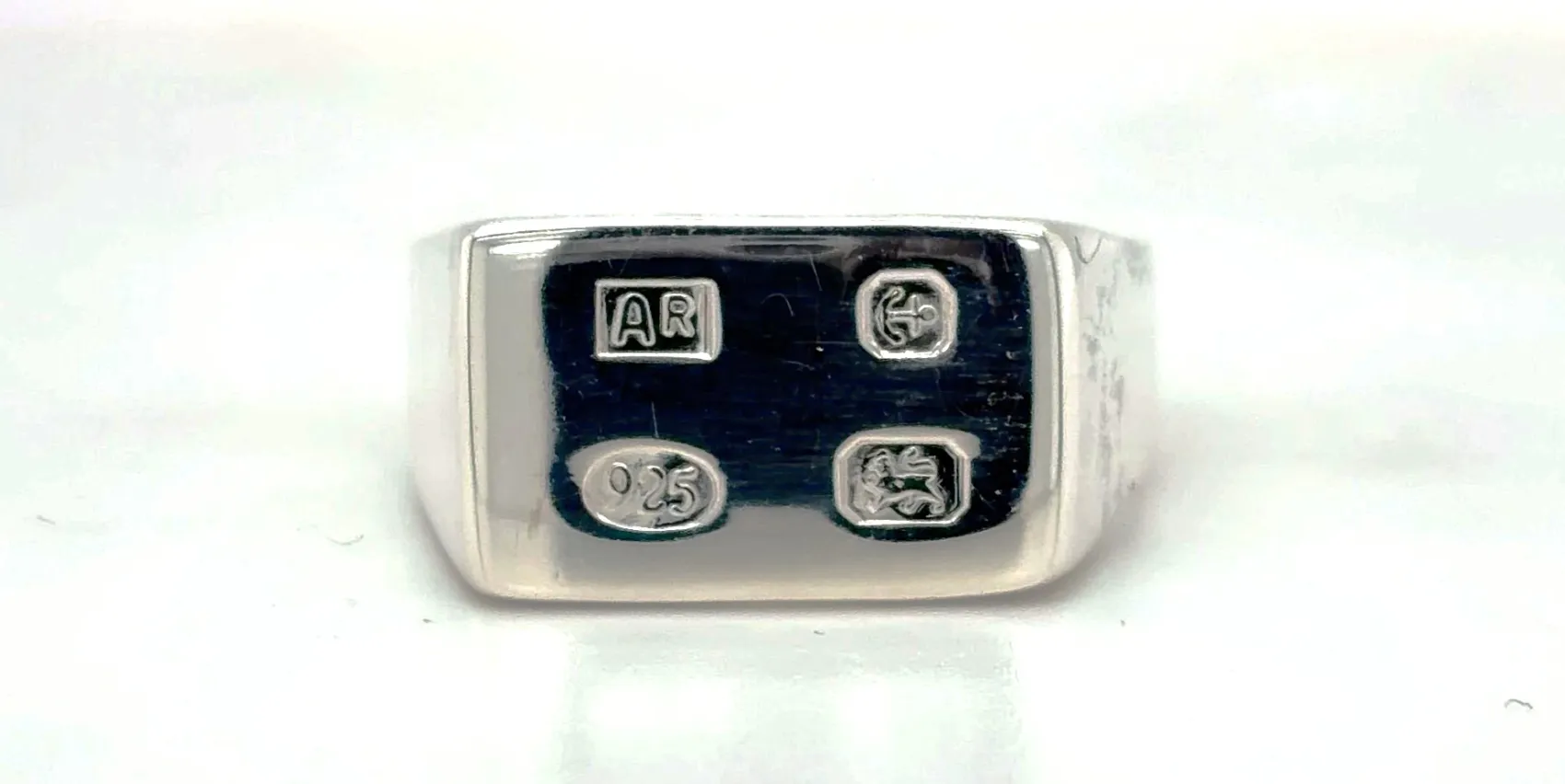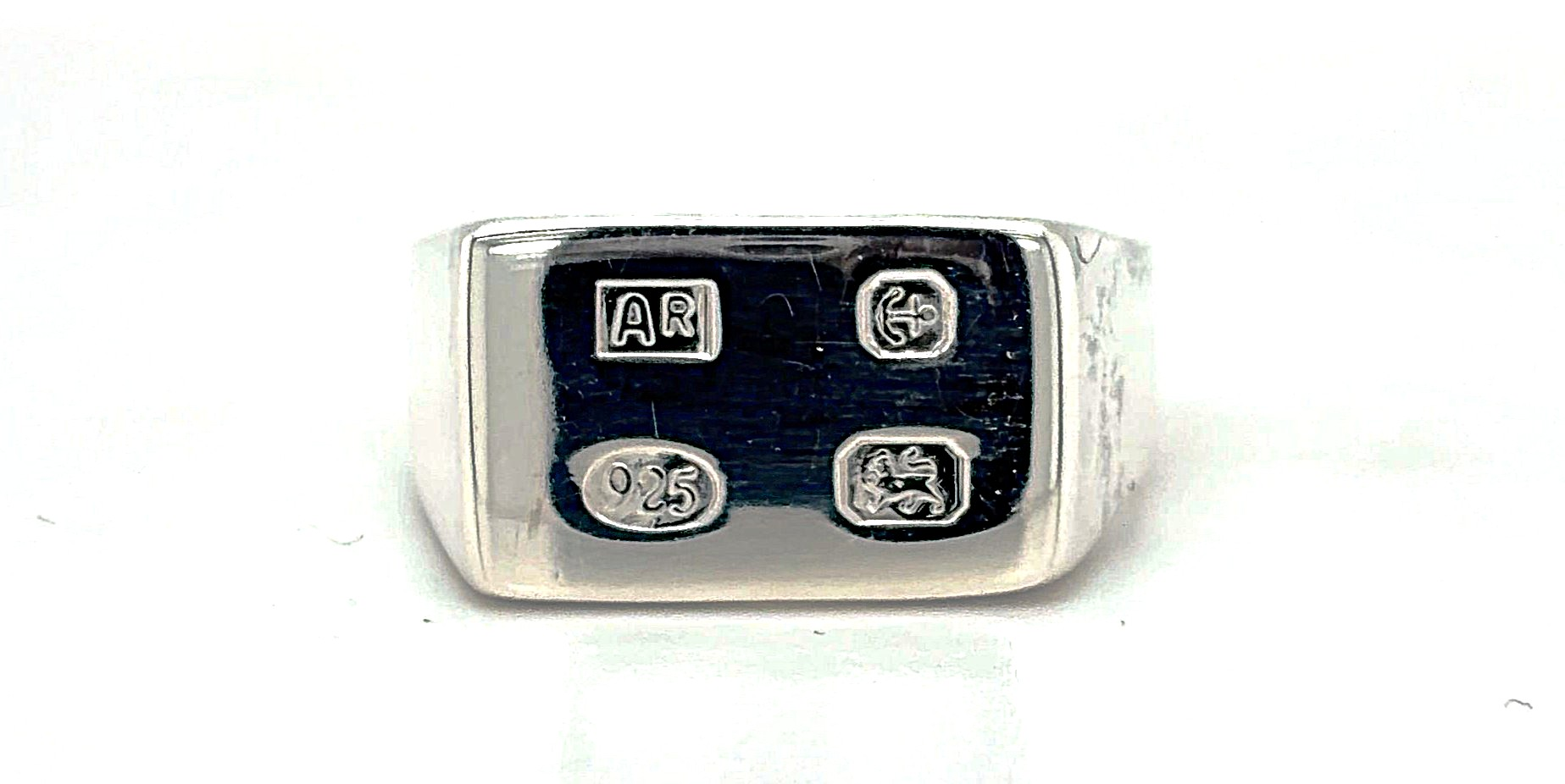 Classic and refined, this sterling silver rectangular stretched hallmark signet ring features a bold rectangular face with hallmark detailing, giving it a timeless and distinguished appearance. Its polished finish ensures a sleek, premium look suitable for everyday wear or special occasions. Crafted from high-quality 925 sterling silver, the ring weighs 8.7 grams, providing a solid, comfortable feel on the finger. The stretched rectangular face offers ample space for engraving or personalization, making it ideal as a personal keepsake or meaningful gift. A versatile and stylish accessory, this signet ring is perfect for those seeking heritage-inspired jewellery with enduring appeal.