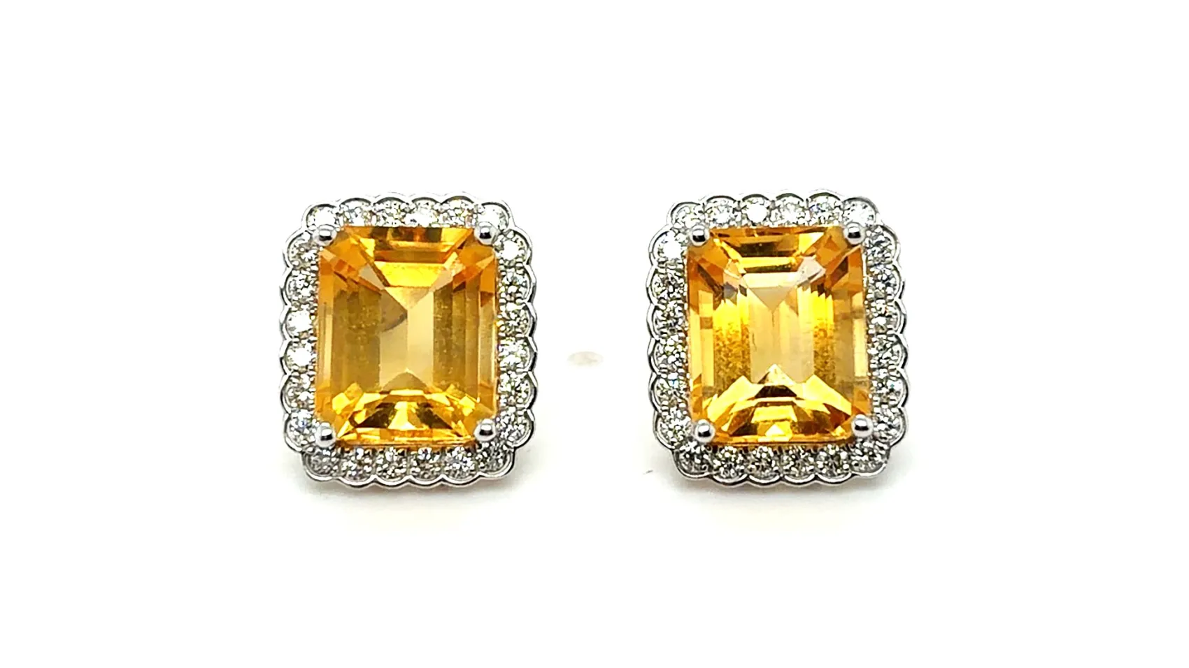 Add a touch of radiant elegance with these stunning citrine and diamond stud earrings. Each earring features a vibrant 8.55 carat citrine, showcasing a warm golden-yellow hue that catches the light beautifully. Accentuating the design are 0.75 carats of sparkling diamonds, adding brilliance and sophistication to this luxurious pair. Expertly set in 9ct white gold, the polished finish enhances the gemstones’ natural beauty while offering a sleek and contemporary look. With dimensions of approximately 15.3mm x 13.3mm and a total weight of 5.3 grams, these earrings provide a comfortable yet striking statement for any occasion. Perfect for elevating everyday wear or adding glamour to special events, these earrings are a timeless addition to any fine jewellery collection. Key Features