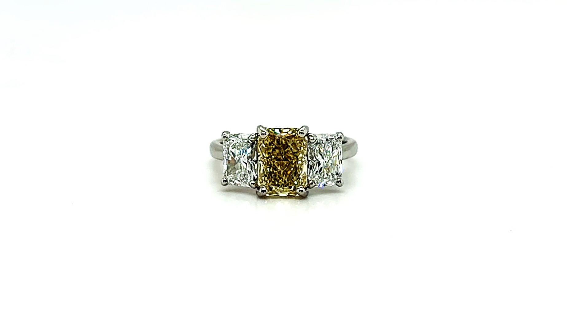 Celebrate elegance and colour with this stunning trilogy ring, featuring 3.77 carats of lab grown diamonds in a striking combination of yellow and white stones. The central yellow diamond is beautifully flanked by two sparkling white diamonds, creating a timeless design that symbolizes past, present, and future. Expertly crafted in platinum, the setting offers superior durability and a naturally bright finish, enhancing the brilliance of each diamond. The sophisticated trilogy design makes this ring ideal as an engagement ring, anniversary gift, or statement piece. With a total weight of approximately 5.92 grams, the ring combines comfort and substantial presence, perfect for daily wear or special occasions. Key Features